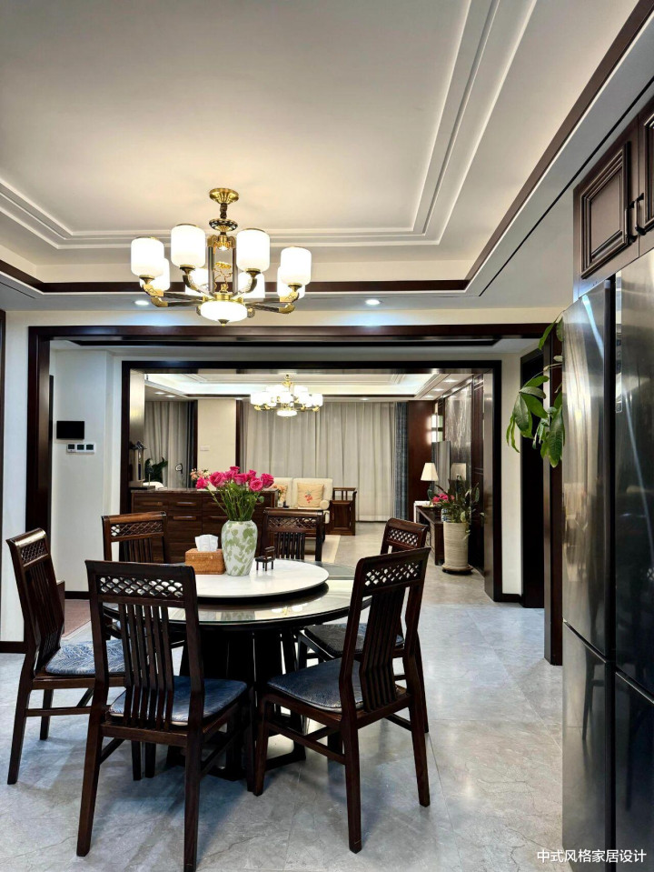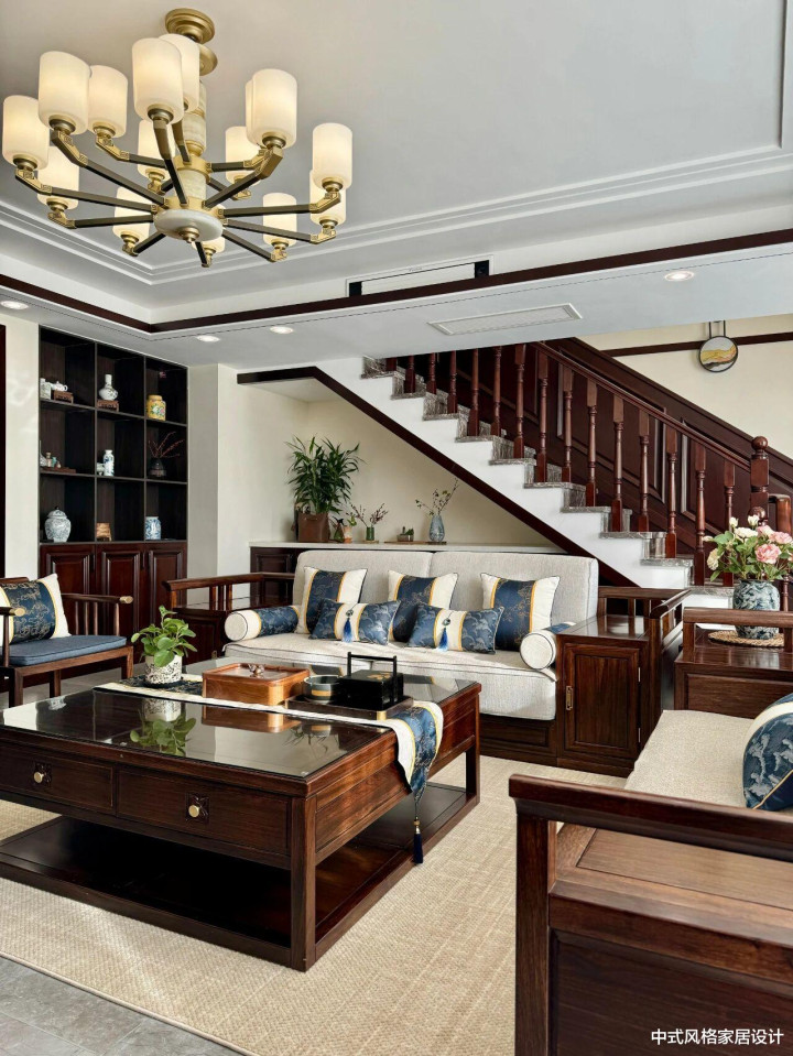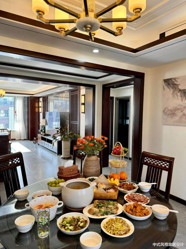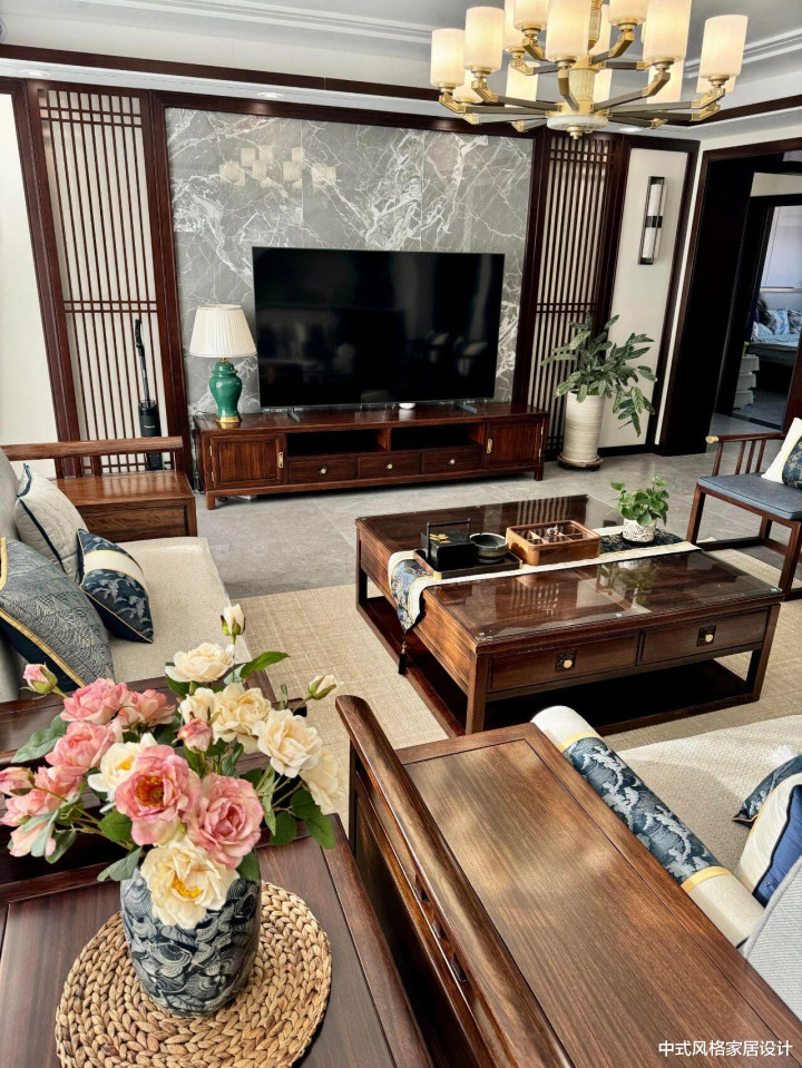 新中式讲究“隔而不断”的空间意境。我在224平的空间里,巧妙运用了月洞门、屏风、博古架等元素划分功能区域。客厅与茶室之间,一扇精致的回纹图案屏风既保持了空间的独立性,又不完全封闭视线,营造出通透流畅的视觉效果。