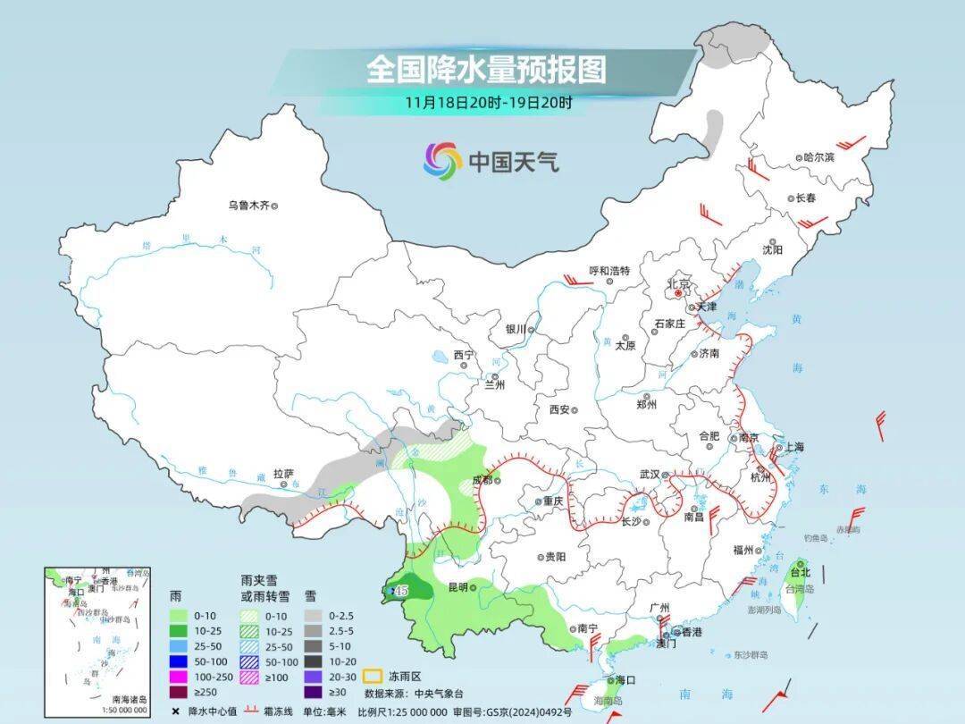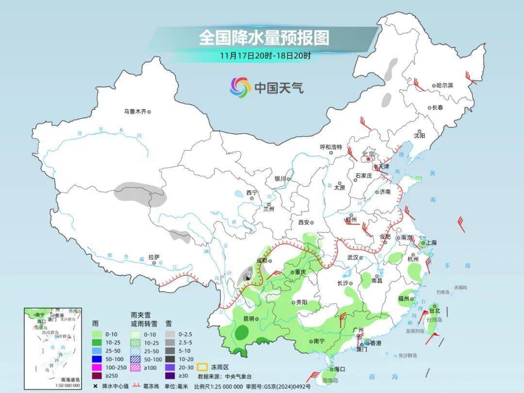 总体来看,这次寒潮过程带来的雨雪天气不多。明天,北方的雨雪将基本结束,南方雨雪南压,多以弱阴雨天气为主。