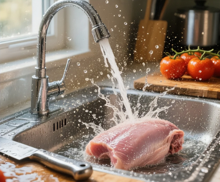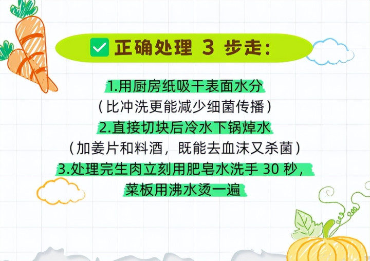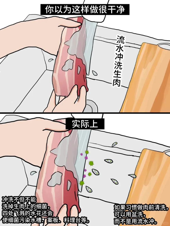所以,如果你平时洗生肉,是用水龙头直接冲,赶紧改掉这个坏习惯吧。